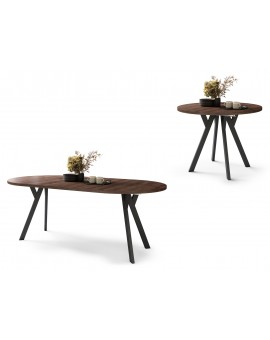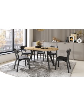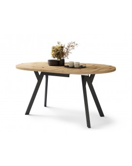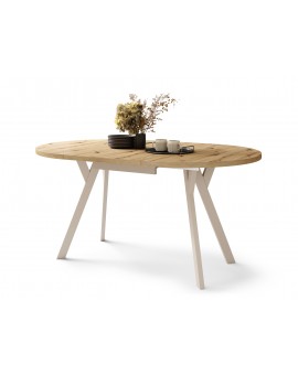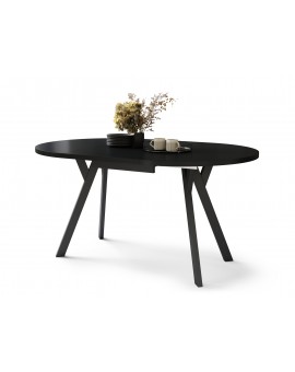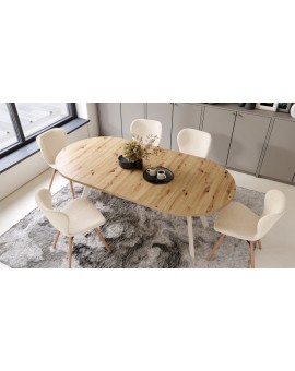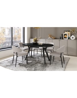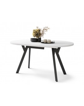 De stevige constructie rust op stevige poten van gepoedercoat staal, wat duurzaamheid en een modern karakter garandeert. Het ronde tafelblad biedt comfort en bevordert de integratie bij gemeenschappelijke maaltijden, en dankzij het ingebouwde uitschuifmechanisme kan de tafel eenvoudig worden vergroot om plaats te bieden aan meer mensen.